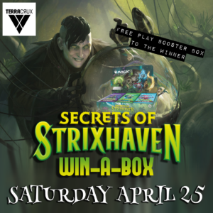 Join us this Saturday, April 25th for your chance to win a Sealed Booster Box of Secrets of Strixhaven at our WIN-A-BOX draft event.